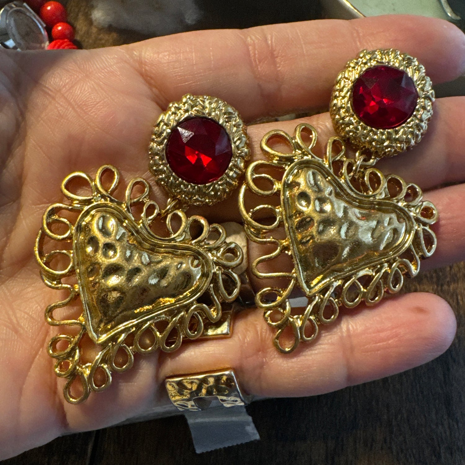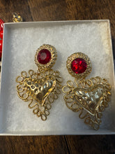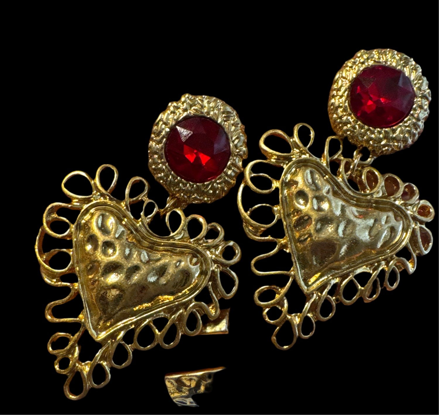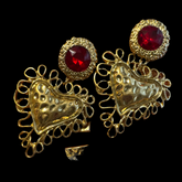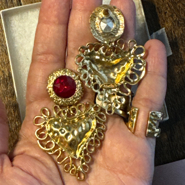 “Make a bold statement with these vintage Bauer earrings, featuring dazzling ruby-red stones and intricately crafted gold hearts. This eye-catching pair embodies the glam and fun of 1980s jewelry with its oversized design and striking color contrast. Perfect for those who love to stand out and bring a little retro flair to any outfit.”