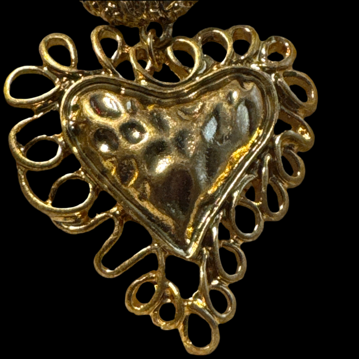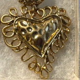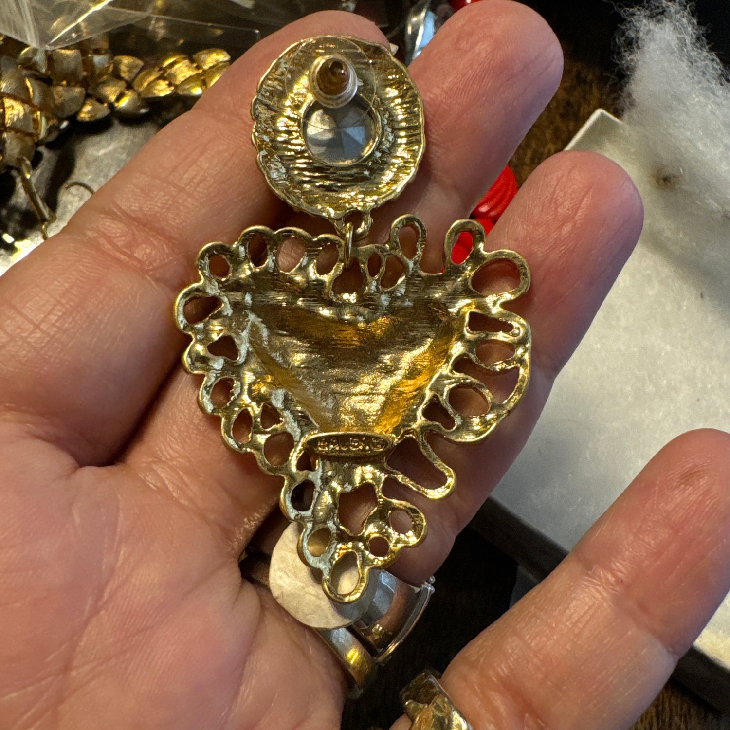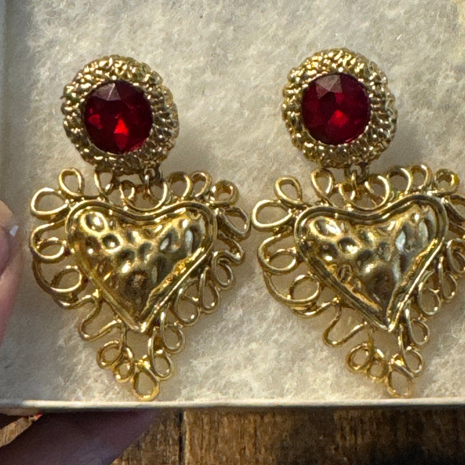 “Make a bold statement with these vintage Bauer earrings, featuring dazzling ruby-red stones and intricately crafted gold hearts. This eye-catching pair embodies the glam and fun of 1980s jewelry with its oversized design and striking color contrast. Perfect for those who love to stand out and bring a little retro flair to any outfit.”